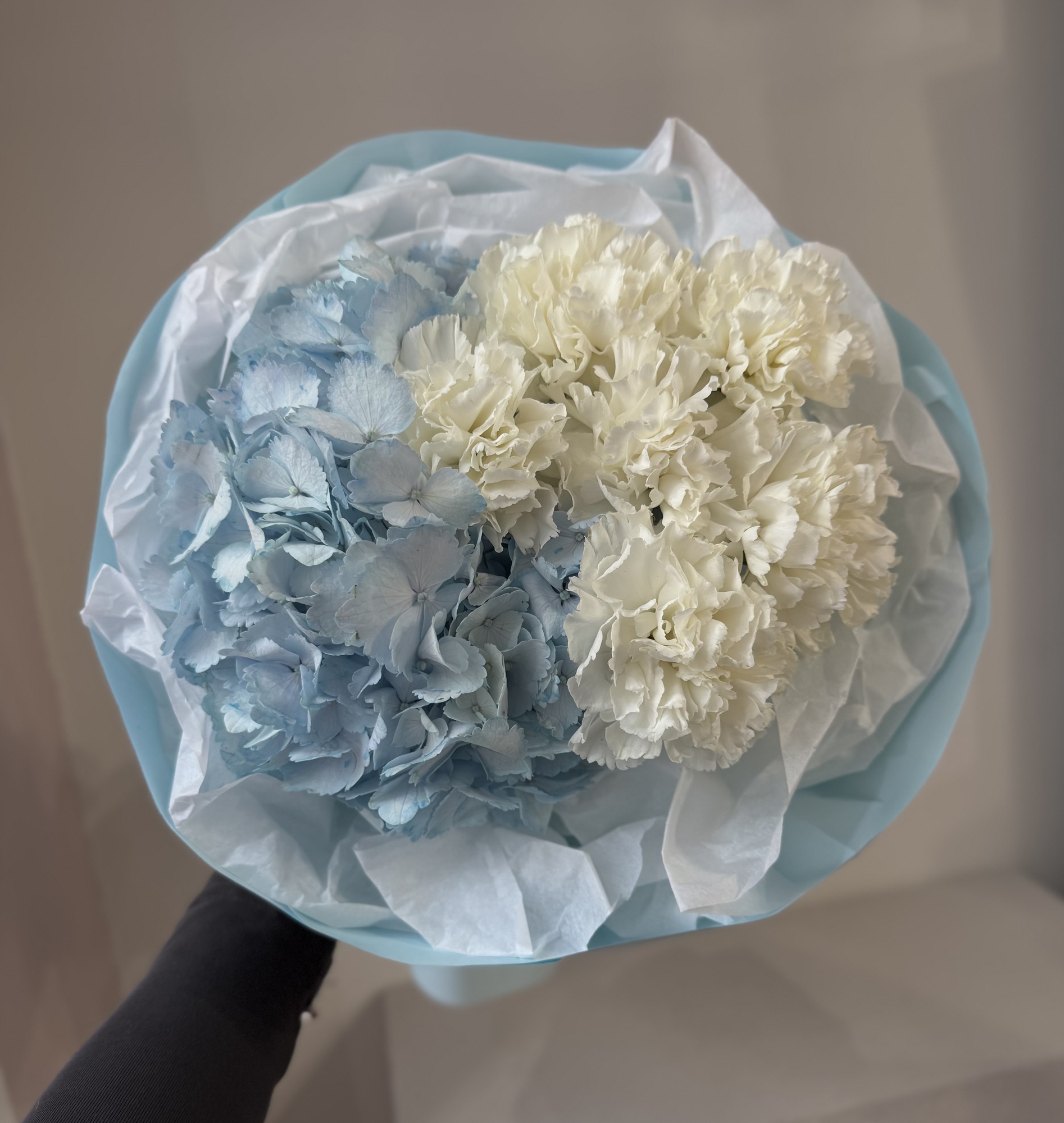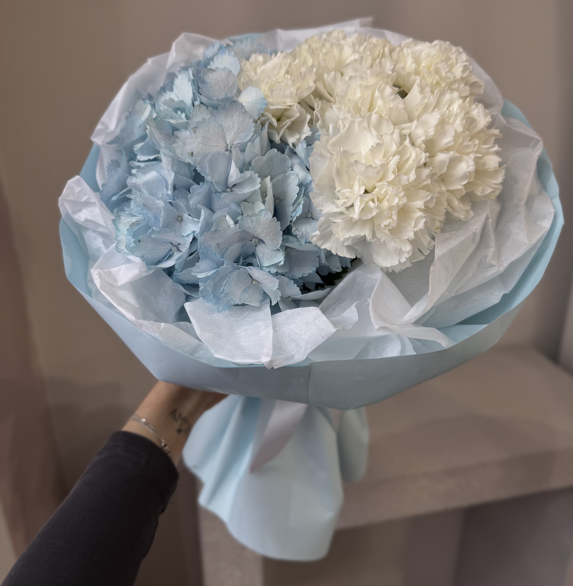Букет с голубой гортензией и белыми диантусами