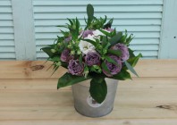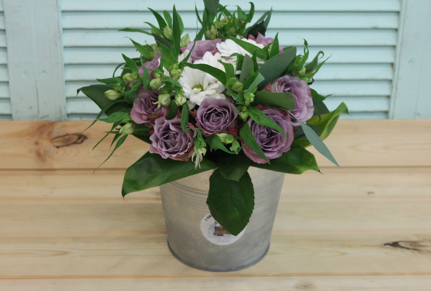Главная / Наши работы / Фотосессия букета с сиреневыми розами в ведерке